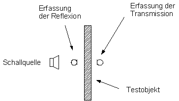 Der Transmissionsgrad wird aus dem Verhältnis der mit und ohne Material gemessenen Schallenergien berechnet, wobei auch hier die Messung an einem Punkt im Raum erfolgt.