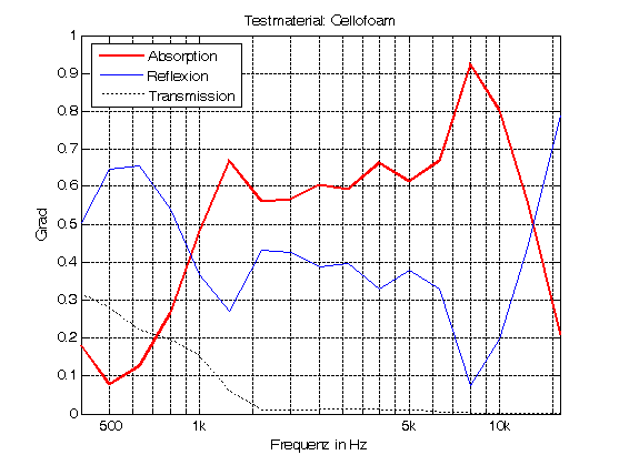 Der Absorptionsgrad wird aus dem Reflexions- und dem Transmissionsgrad berechnet und als Funktion der Frequenz in Terzbändern von 500Hz bis 16kHz angegeben, wobei die Energieverluste durch Streuung nicht erfasst werden.